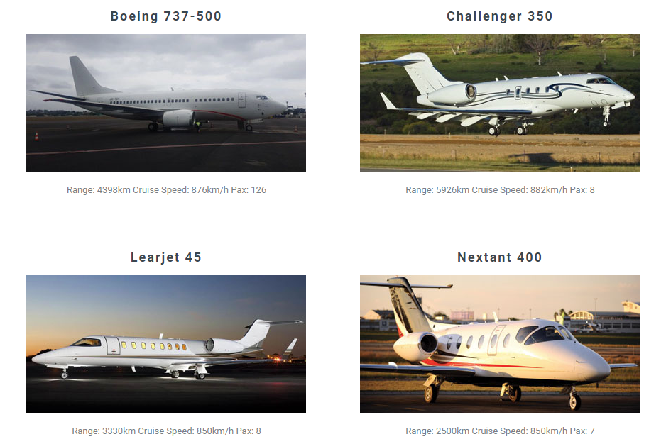 - Learjet 45 – Range: 3330km Cruise Speed: 850km/h Pax: 8