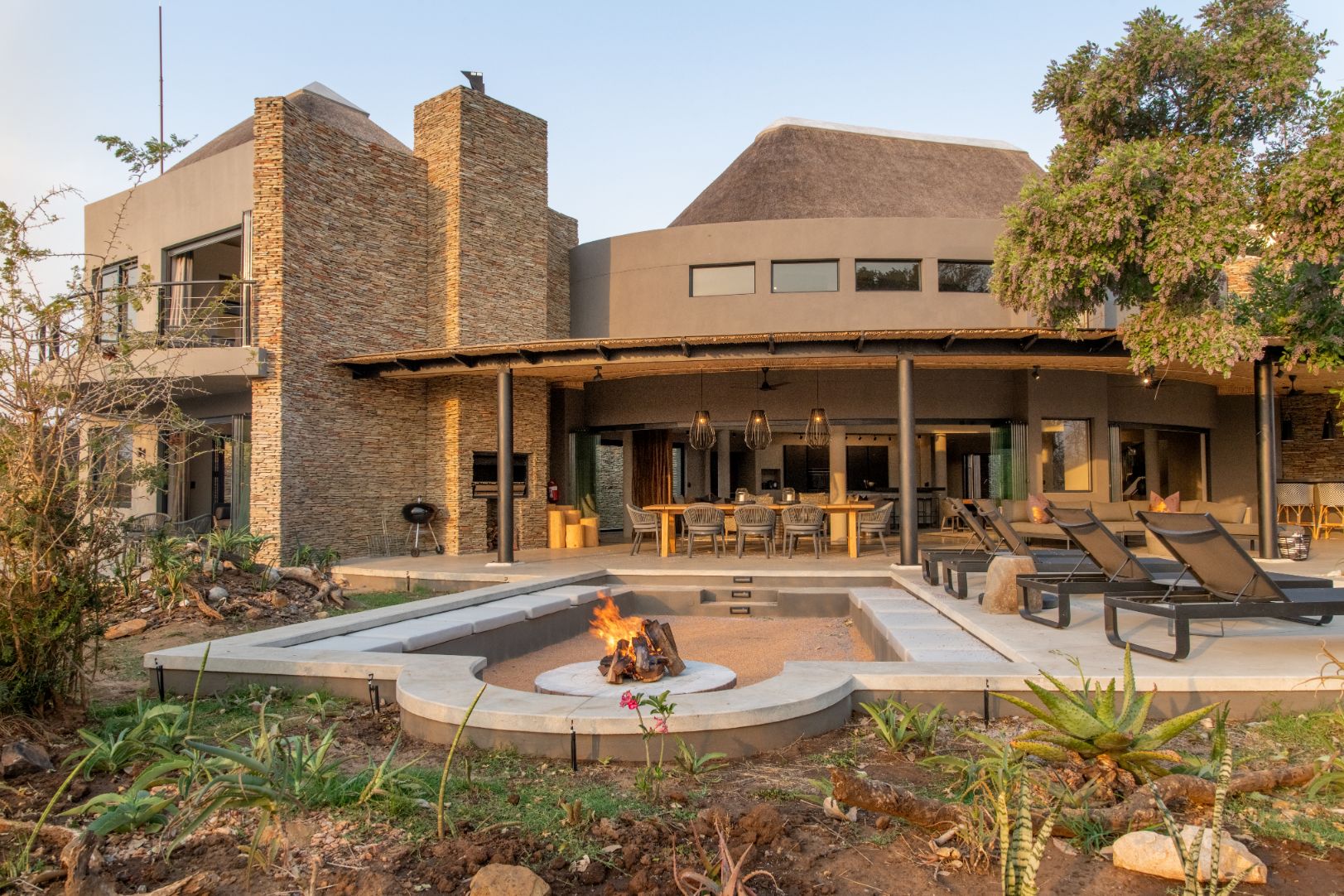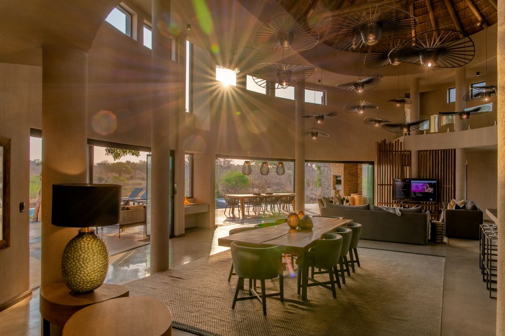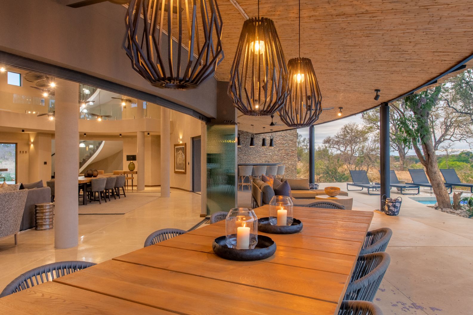 Mpfuvu Lodge is a fresh and contemporary interpretation of the traditional African safari lodge. The luxurious colour palette encompasses organic textures and materials, which are inspired by the African landscapes.The expansive outdoor living and entertaining space provides breath taking views overlooking the Sabie River and into the Kruger National Park.