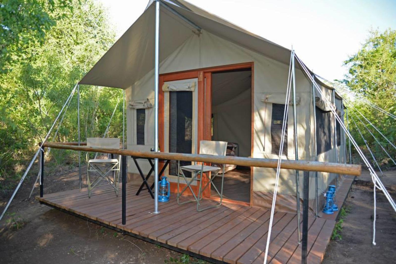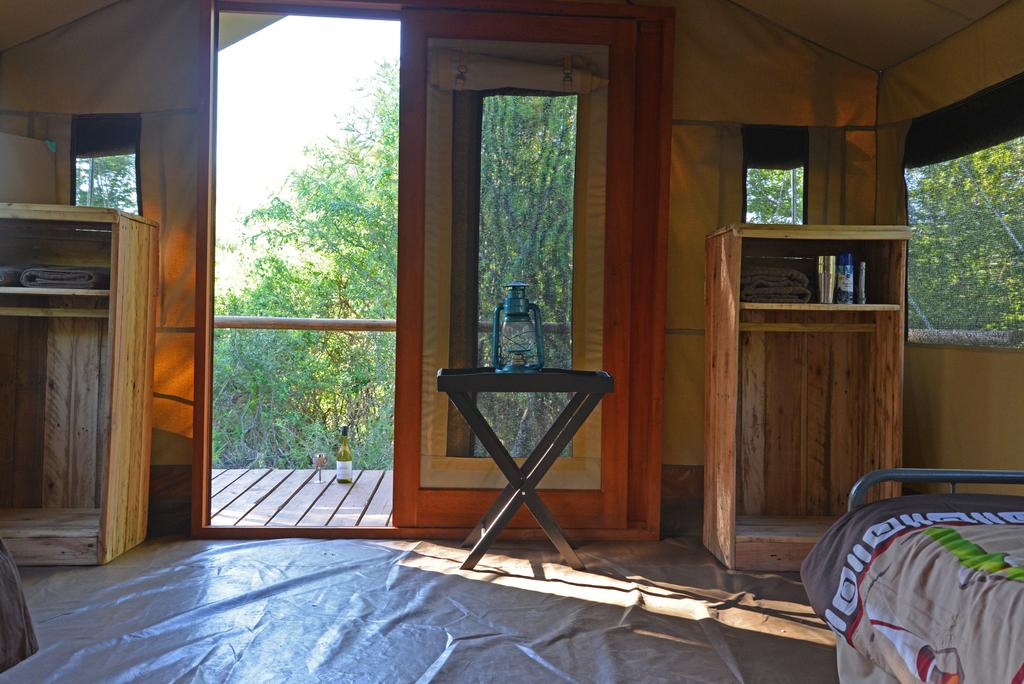 - Semi-Luxury Cottage Tent (Double bed) – Luxury cottage tent with en-suite shower bathroom. The bathroom has hot and cold water, but the tents have no electricity. It furthermore has a large boma-restaurant area situated on a meandering dry river bed.