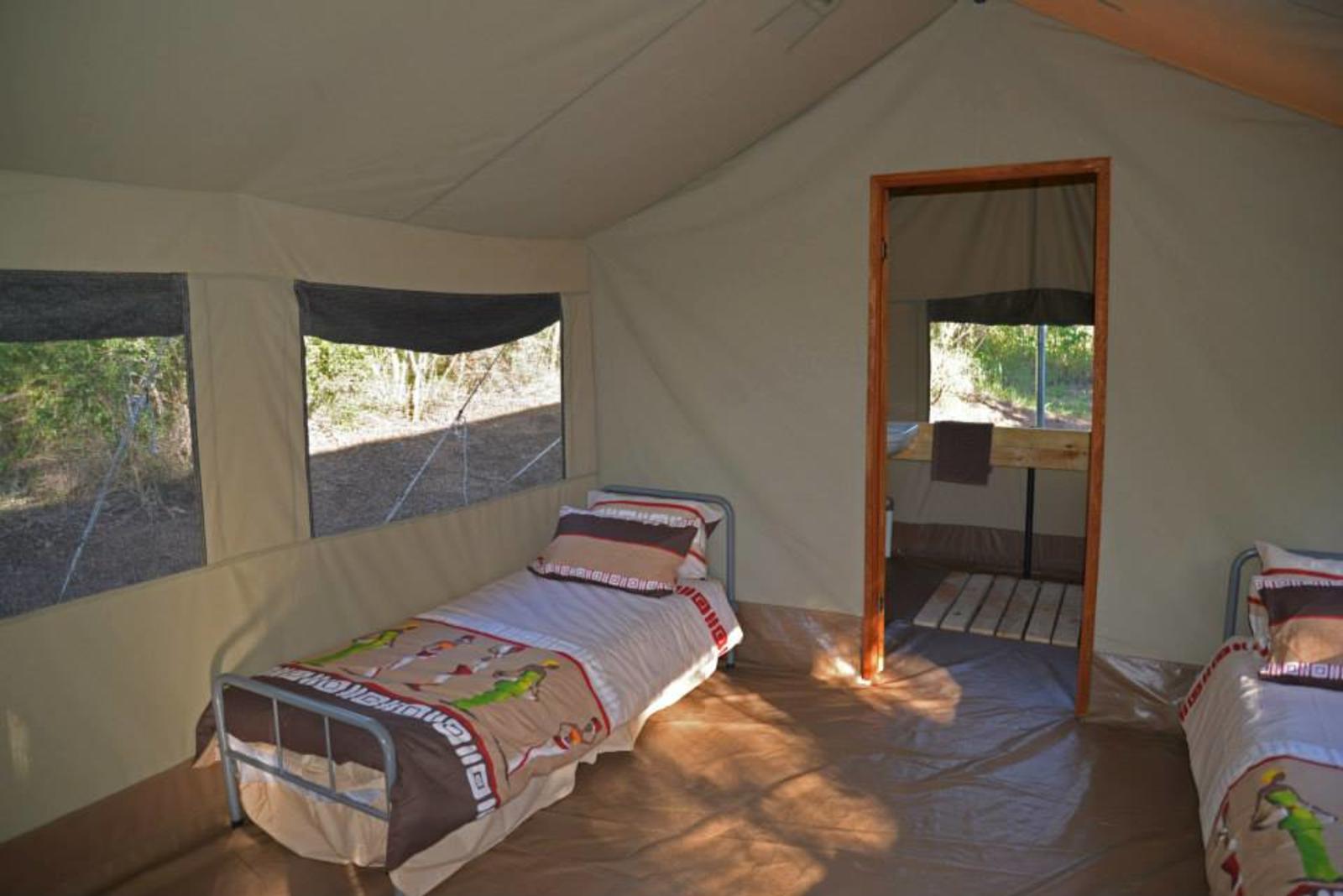 - Semi-Luxury Cottage Tent (Twin beds) – Luxury cottage tent with en-suite shower bathroom. The bathroom has hot and cold water, but the tents have no electricity. It furthermore has a large boma-restaurant area situated on a meandering dry river bed.
